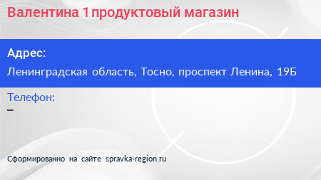 Валентина-1, продуктовый магазин по адресу Ленинградская область, Тосно, проспект Ленина, 19Б в дальнейшем Организация, размещена в следующих категориях: