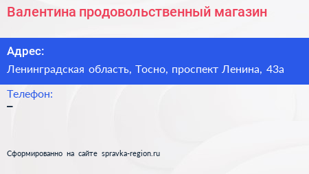 Валентина, продовольственный магазин по адресу Ленинградская область, Тосно, проспект Ленина, 43а в дальнейшем Организация, размещена в следующих категориях: