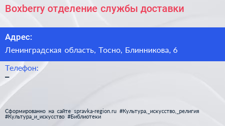 Boxberry, отделение службы доставки по адресу Ленинградская область, Тосно, Блинникова, 6 в дальнейшем Организация, размещена в следующих категориях: