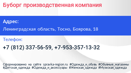 Буборг, производственная компания по адресу Ленинградская область, Тосно, Боярова, 18 в дальнейшем Организация, размещена в следующих категориях: