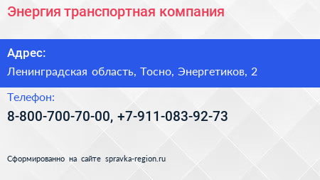 Энергия, транспортная компания по адресу Ленинградская область, Тосно, Энергетиков, 2 в дальнейшем Организация, размещена в следующих категориях: