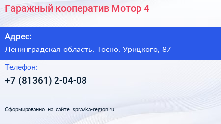Гаражный кооператив Мотор-4 по адресу Ленинградская область, Тосно, Урицкого, 87 в дальнейшем Организация, размещена в следующих категориях: