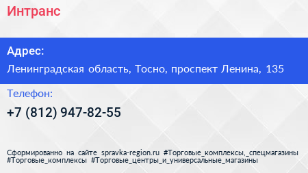 Интранс по адресу Ленинградская область, Тосно, проспект Ленина, 135 в дальнейшем Организация, размещена в следующих категориях: