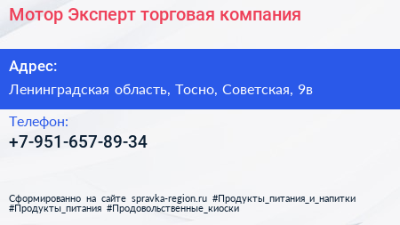Мотор-Эксперт, торговая компания по адресу Ленинградская область, Тосно, Советская, 9в в дальнейшем Организация, размещена в следующих категориях: