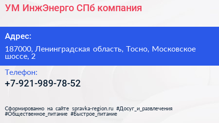 УМ ИнжЭнерго СПб, компания по адресу 187000, Ленинградская область, Тосно, Московское шоссе, 2 в дальнейшем Организация, размещена в следующих категориях: