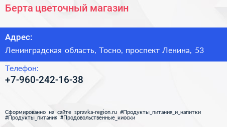 Берта, цветочный магазин по адресу Ленинградская область, Тосно, проспект Ленина, 53 в дальнейшем Организация, размещена в следующих категориях: