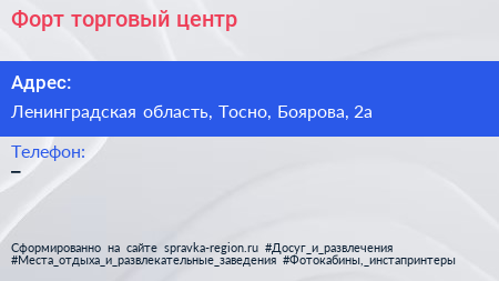 Форт, торговый центр по адресу Ленинградская область, Тосно, Боярова, 2а в дальнейшем Организация, размещена в следующих категориях: