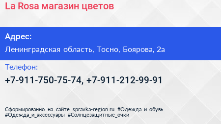La Rosa, магазин цветов по адресу Ленинградская область, Тосно, Боярова, 2а в дальнейшем Организация, размещена в следующих категориях: