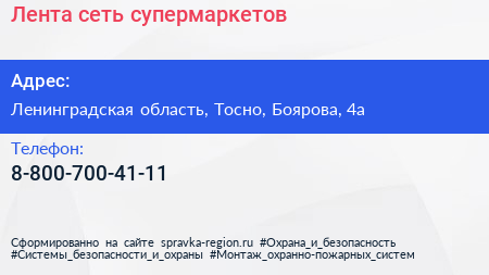 Лента, сеть супермаркетов по адресу Ленинградская область, Тосно, Боярова, 4а в дальнейшем Организация, размещена в следующих категориях: