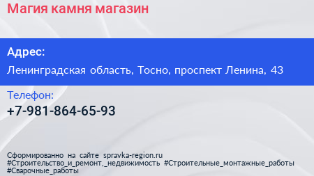 Магия камня, магазин по адресу Ленинградская область, Тосно, проспект Ленина, 43 в дальнейшем Организация, размещена в следующих категориях:
