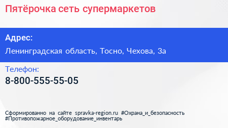 Пятёрочка, сеть супермаркетов по адресу Ленинградская область, Тосно, Чехова, 3а в дальнейшем Организация, размещена в следующих категориях: