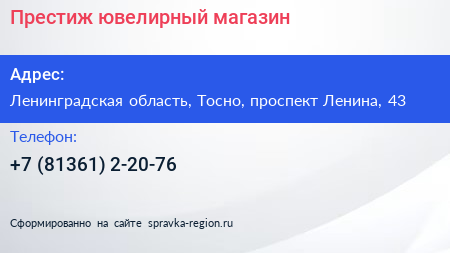 Престиж, ювелирный магазин по адресу Ленинградская область, Тосно, проспект Ленина, 43 в дальнейшем Организация, размещена в следующих категориях: