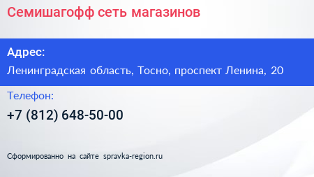 Семишагофф, сеть магазинов по адресу Ленинградская область, Тосно, проспект Ленина, 20 в дальнейшем Организация, размещена в следующих категориях: