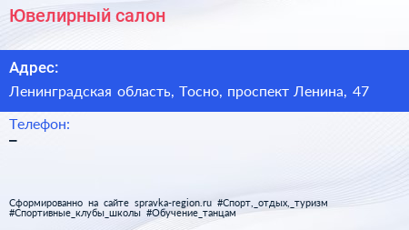 Ювелирный салон по адресу Ленинградская область, Тосно, проспект Ленина, 47 в дальнейшем Организация, размещена в следующих категориях: