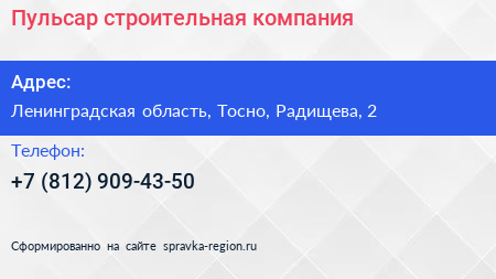 Пульсар, строительная компания по адресу Ленинградская область, Тосно, Радищева, 2 в дальнейшем Организация, размещена в следующих категориях: