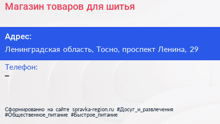 Магазин товаров для шитья по адресу Ленинградская область, Тосно, проспект Ленина, 29 в дальнейшем Организация, размещена в следующих категориях: