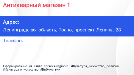 Антикварный магазин №1 по адресу Ленинградская область, Тосно, проспект Ленина, 28 в дальнейшем Организация, размещена в следующих категориях:
