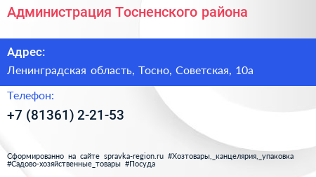 Администрация Тосненского района по адресу Ленинградская область, Тосно, Советская, 10а в дальнейшем Организация, размещена в следующих категориях: