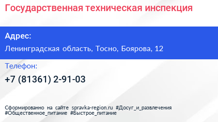 Государственная техническая инспекция по адресу Ленинградская область, Тосно, Боярова, 12 в дальнейшем Организация, размещена в следующих категориях: