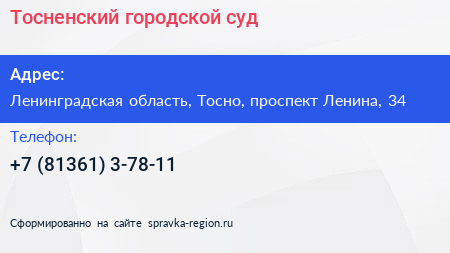 Тосненский городской суд по адресу Ленинградская область, Тосно, проспект Ленина, 34 в дальнейшем Организация, размещена в следующих категориях: