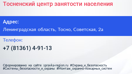 Тосненский центр занятости населения по адресу Ленинградская область, Тосно, Советская, 2а в дальнейшем Организация, размещена в следующих категориях:
