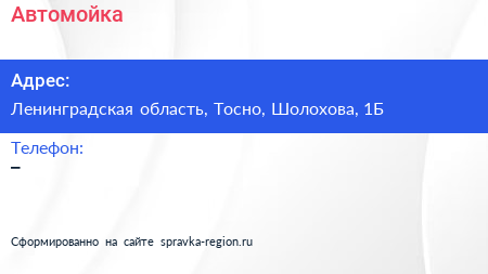 Автомойка по адресу Ленинградская область, Тосно, Шолохова, 1Б в дальнейшем Организация, размещена в следующих категориях: