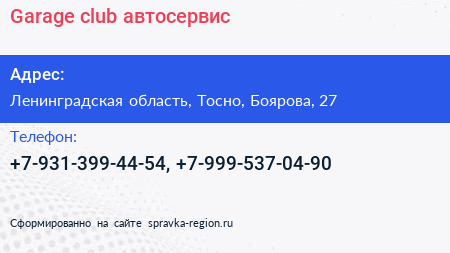 Garage club, автосервис по адресу Ленинградская область, Тосно, Боярова, 27 в дальнейшем Организация, размещена в следующих категориях: