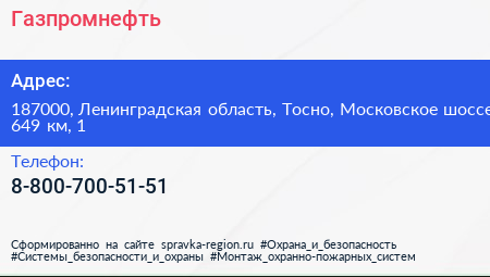 Газпромнефть по адресу 187000, Ленинградская область, Тосно, Московское шоссе 649 км, 1 в дальнейшем Организация, размещена в следующих категориях: