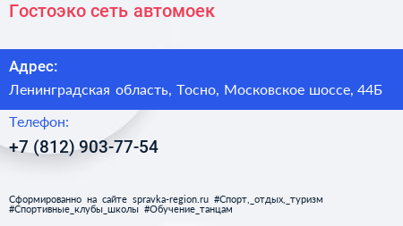 Гостоэко, сеть автомоек по адресу Ленинградская область, Тосно, Московское шоссе, 44Б в дальнейшем Организация, размещена в следующих категориях: