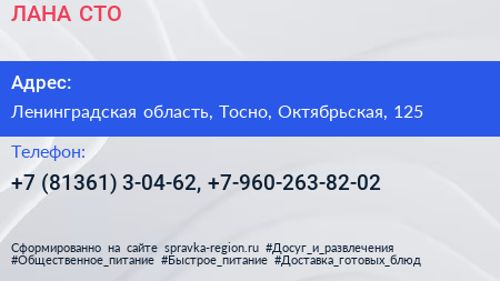 ЛАНА, СТО по адресу Ленинградская область, Тосно, Октябрьская, 125 в дальнейшем Организация, размещена в следующих категориях: