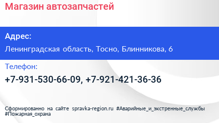 Магазин автозапчастей по адресу Ленинградская область, Тосно, Блинникова, 6 в дальнейшем Организация, размещена в следующих категориях: