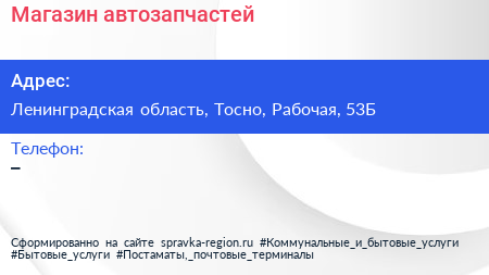 Магазин автозапчастей по адресу Ленинградская область, Тосно, Рабочая, 53Б в дальнейшем Организация, размещена в следующих категориях: