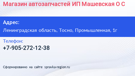 Магазин автозапчастей, ИП Машевская О.С. по адресу Ленинградская область, Тосно, Промышленная, 1г в дальнейшем Организация, размещена в следующих категориях: