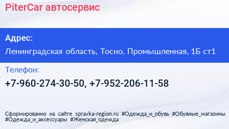 PiterCar, автосервис по адресу Ленинградская область, Тосно, Промышленная, 1Б ст1 в дальнейшем Организация, размещена в следующих категориях: