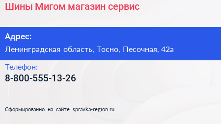 Шины Мигом, магазин-сервис по адресу Ленинградская область, Тосно, Песочная, 42а в дальнейшем Организация, размещена в следующих категориях: