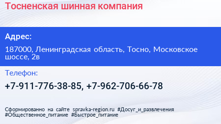 Тосненская шинная компания по адресу 187000, Ленинградская область, Тосно, Московское шоссе, 2в в дальнейшем Организация, размещена в следующих категориях: