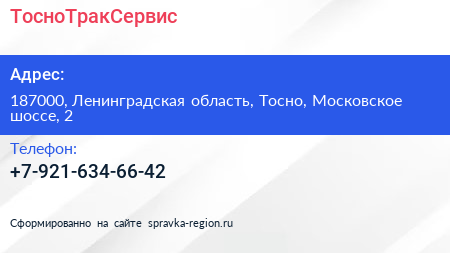 ТосноТракСервис по адресу 187000, Ленинградская область, Тосно, Московское шоссе, 2 в дальнейшем Организация, размещена в следующих категориях:
