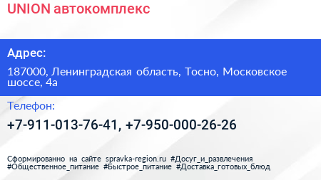 UNION, автокомплекс по адресу 187000, Ленинградская область, Тосно, Московское шоссе, 4а в дальнейшем Организация, размещена в следующих категориях: