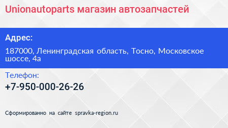 Unionautoparts, магазин автозапчастей по адресу 187000, Ленинградская область, Тосно, Московское шоссе, 4а в дальнейшем Организация, размещена в следующих категориях: