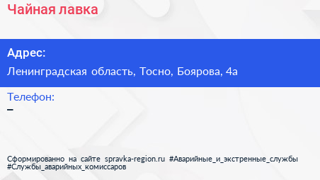 Чайная лавка по адресу Ленинградская область, Тосно, Боярова, 4а в дальнейшем Организация, размещена в следующих категориях: