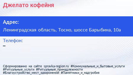 Джелато, кофейня по адресу Ленинградская область, Тосно, шоссе Барыбина, 10а в дальнейшем Организация, размещена в следующих категориях: