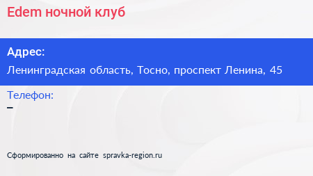 Edem, ночной клуб по адресу Ленинградская область, Тосно, проспект Ленина, 45 в дальнейшем Организация, размещена в следующих категориях: