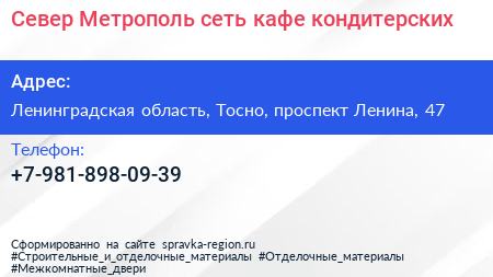Север-Метрополь, сеть кафе-кондитерских по адресу Ленинградская область, Тосно, проспект Ленина, 47 в дальнейшем Организация, размещена в следующих категориях: