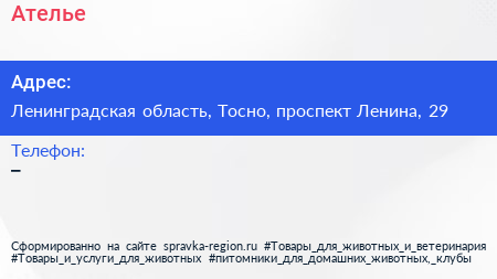 Ателье по адресу Ленинградская область, Тосно, проспект Ленина, 29 в дальнейшем Организация, размещена в следующих категориях: