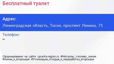Бесплатный туалет по адресу Ленинградская область, Тосно, проспект Ленина, 71 в дальнейшем Организация, размещена в следующих категориях: