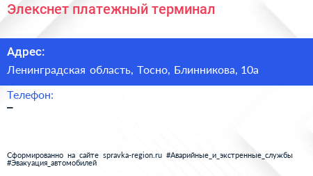Элекснет, платежный терминал по адресу Ленинградская область, Тосно, Блинникова, 10а в дальнейшем Организация, размещена в следующих категориях: