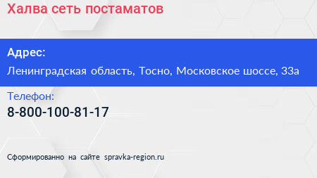 Халва, сеть постаматов по адресу Ленинградская область, Тосно, Московское шоссе, 33а в дальнейшем Организация, размещена в следующих категориях: