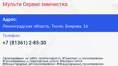 Мульти-Сервис, химчистка по адресу Ленинградская область, Тосно, Боярова, 16 в дальнейшем Организация, размещена в следующих категориях: