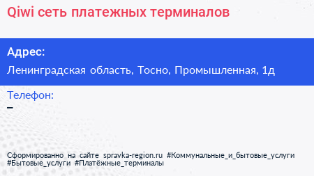 Qiwi, сеть платежных терминалов по адресу Ленинградская область, Тосно, Промышленная, 1д в дальнейшем Организация, размещена в следующих категориях: