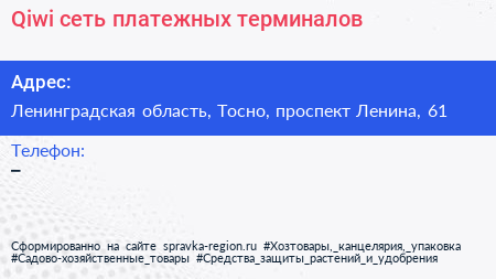 Qiwi, сеть платежных терминалов по адресу Ленинградская область, Тосно, проспект Ленина, 61 в дальнейшем Организация, размещена в следующих категориях: